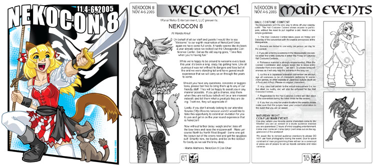 Nekocon 8 Program Guide (2005; InDesign) Greg Bugtong was my co-conspirator for the Nekocon 8 program guide. Graphics were contributed by Nekocon guests and staff, cover designed by Dizziness.